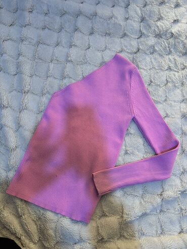 3) Təkqollu bənövşəyi (lilac) rib toxuma top – asimmetrik bir çiyin açıq kəsim, bir qol uzun, elastik kanallı parça, bədənə oturan formaya malik.
