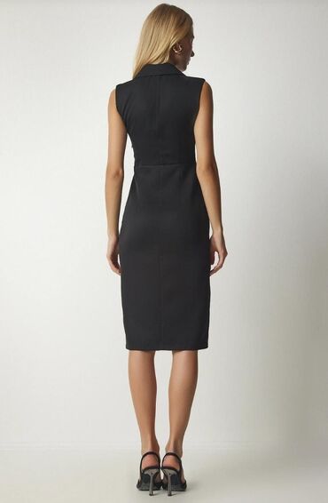 Qara rəngli, dizə qədər uzanan, qolsuz klassik qalıplı don. 45₼ alınıb, təcili satılır. heç geyinilməyib. yenidir. çatdırılma var. İkiqat düymələmə effekti verən ön hissədə 4 ədəd qızılı metal düymə, çevik yaka və vurğulanmış bel kəsimi ilə elegant siluet yaradır. Ön ortada yüngül yarıq hərəkət rahatlığı təmin edir. Arxa hissə hamar və bədənə oturan formadadır. Ofis, tədbir və axşam çıxışları üçün minimalist, şıq seçim. Mat parça, qalın və forma saxlayan toxuma təsiri ilə. Rəng: saf qara. Dizayn detalları: