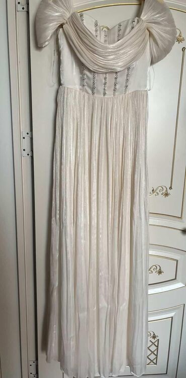 Ağ rəngli uzun ziyafət/libas - Model: off-shoulder (çiyindən açıq), qollarında volan detalları - Uzunluq: yerə qədər, arxası azca sallanan ətək - Kəsim: düz və axıcı siluet, bel hissəsi rahat - Pa...