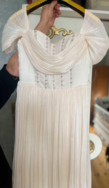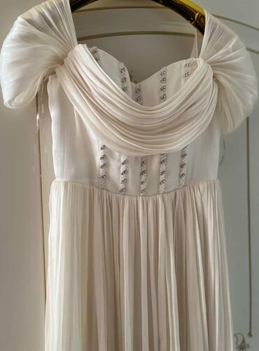 Zərif ziyafət donu - Rəng: açıq bej/şampan - Model: kvadrat yaxalı, midi-uzunluq, ön hissədə dökümlü qatlardan ibarət ətək - Bəzək: sinə xətti boyunca daş və asma zəncirli aplikasiya - Qol: qısa, ...