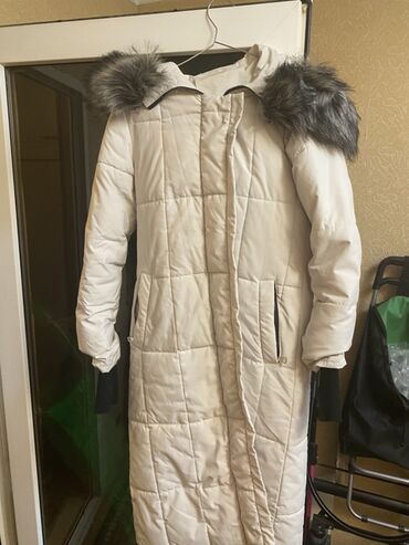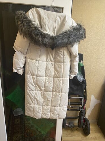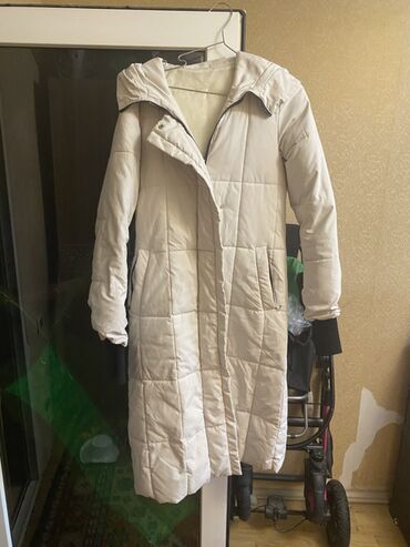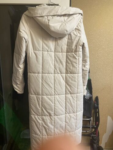 Təmiz, neytral rəng hər kombinə uyğun gəlir; kapüşon və istilik saxlayan manjetlər sayəsində qarlı və küləkli havalarda praktikdir. ölçü etiketinə dair məlumat şəkillərdə görünmür; real ölçü üçün çiyin–diz uzun modeldir.