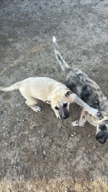 Ağ-qara ləkəli balaca it balaları - Cins: qarışıq - Rəng: əsasən ağ üzərində boz/qara ləkələr - Say: bir neçə balaca (şəkildə görünür) - Xüsusiyyətlər: aktiv, oyunbaz, sosial; açıq məkanda böyüyüb...