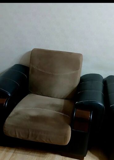 Qəhvəyi-bej yumşaq mebel dəsti - Tərkib: 3 nəfərlik divan + 2 ədəd kreslo - Rəng: qəhvəyi oturacaq və söykənəcəklər, bej əsas hissələr - Üzlük: yumşaq parça, çıxarıla bilən yastıq oturacaqlar - Di...