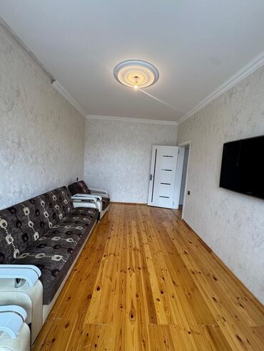 - Otaq: işıqlı, iri pəncərə, ağ tavan bəzəyi (rozeta), ağ qapı, açıq rəng dekorativ divar kağızı