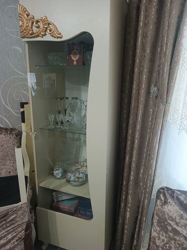 - Daxili görüntü: vitrində müxtəlif serviz qabları və kristal aksesuarların səliqəli yerləşməsi üçün uyğun dərinlik və hündürlük