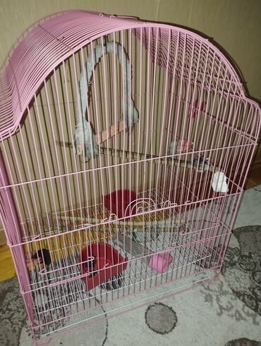 Dalğalı papağan və qəfəs dəsti - Növ: dalğalı (ağ-sarı başlı, yaşıl bədənli) kiçik papağan - Qəfəs: bənövşəyi altlıq və ağ metal barmaqlıqlar, şarjvari qövs damlı dizayn - Ölçü: hündür, geniş hərə...