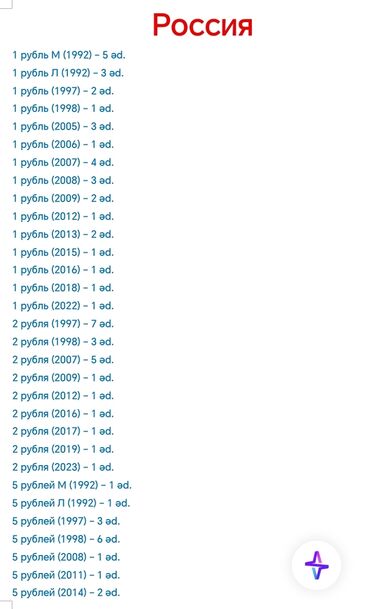 - 2 rubl: 1997 – 7 əd., 1998 – 3 əd., 2007 – 5 əd., 2009 – 1 əd., 2012 – 1 əd., 2016 – 1 əd., 2017 – 1 əd., 2019 – 1 əd., 2023 – 1 əd.