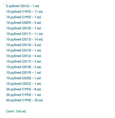 - 5 rubl: 1992 (M – 1 əd., L – 1 əd.), 1997 – 3 əd., 1998 – 6 əd., 2008 – 1 əd., 2011 – 1 əd., 2014 – 2 əd., 2016 – 1 əd.