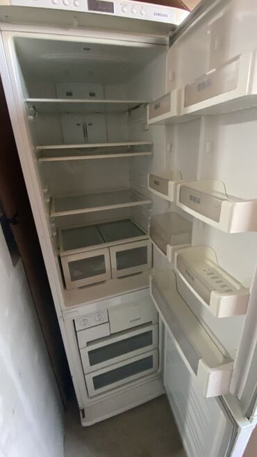 Mətbəx, ofis və ya yaylıq üçün geniş həcmli, funksional Samsung soyuducu. Model üzərində “Samsung” loqosu və elektron panel mövcuddur.