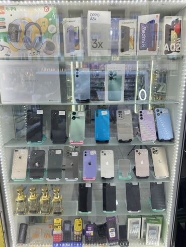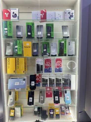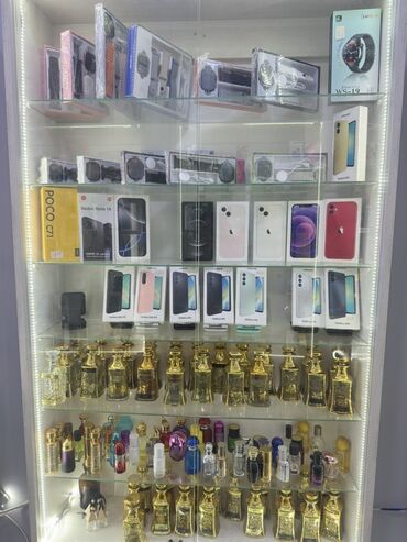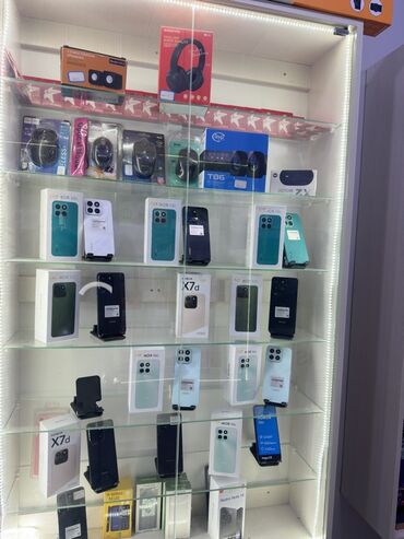 Elektronika vitrinində müxtəlif brend smartfonlar, aksesuarlar