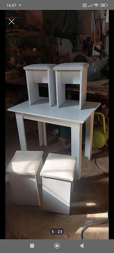 Mətbəx üçün kompakt masa və 4 taburet komplekti. Xüsusiyyətlər: - Dördkünc masa: ağ rəngli laminat səth, tünd haşiyəli dizayn, möhkəm karkas. - 4 ədəd taburet: yumşaq oturacaq hissəsi (müxtəlif rə...