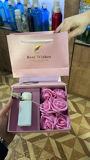- Hədiyyə dəsti: zərif qutu, “Best Wishes” dizaynlı hədiyyə paketində sprey flakon və dekorativ güllər – təqdimat üçün ideal görünüş.