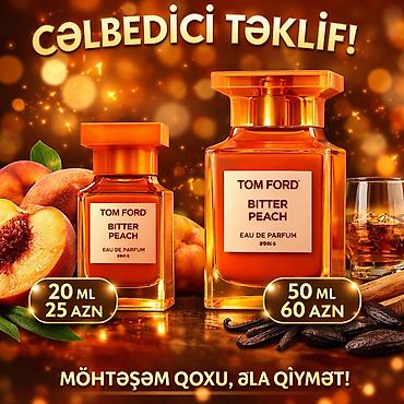 - Tom Ford Bitter Peach Eau de Parfum: şaftalı, vanil və isti ədviyyatların cazibədar qarışığı. Şəkildə göstərilən həcmlər və qiymətlər: 20 ml – 25 AZN, 50 ml – 60 AZN.