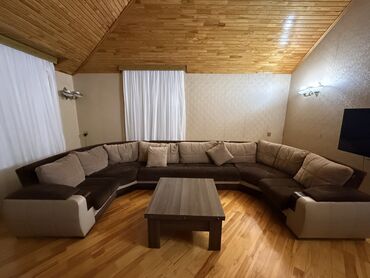Künc divan dəsti - Tərkib: 2 hissədən ibarət künc divan, ortada üçbucaq formalı bərk taxta künc masa/rəf modulu - Rəng və material: tünd qəhvəyi–krem rəng kombinasiyası, yanlar və oturacaqlarda də...