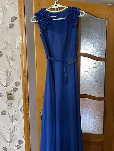 Mavi ziyafət/libas Azze markasi 38 razmer - Rəng: dərin mavi - Model: Uzun, yarıdərin yarıq effektli ön hissə, asimmetrik büzgü və kristal daşlı broş detalı - Parça: Satinə bənzər parıltılı əsas ...
