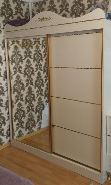 - Kupe dolab: sürüşən qapılar, biri tam boy güzgülü, digəri krem rəngli panellidir; qızılı xətt və naxış vurğuları. Geniş saxlama üçün nəzərdə tutulub.