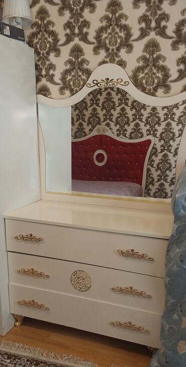 - Tualet masası güzgü ilə: krem-ağ rəng, qızılı dekor elementləri, 3 geniş çekmece; üstündə iri güzgü çərçivəsi.