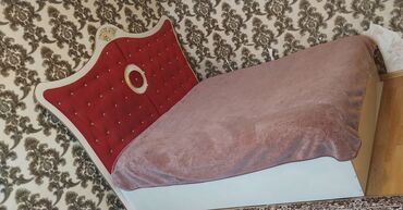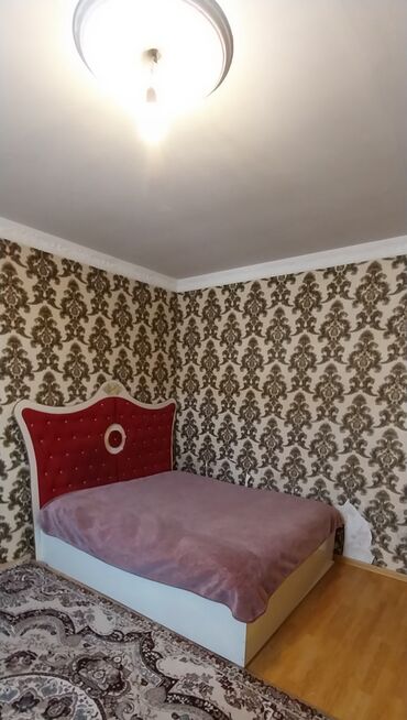 - İki nəfərlik çarpayı: ağ korpus, dekorativ qırmızı başlıq (pərdəli düymə işləmələri və qızılı naxış detalı). Karkas yüksəklikli, alt hissə qapalı.
