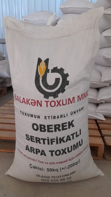- Sertifikatlı arpa toxumu – “OBEREK” çeşidi. Qablaşdırma: kisə, üzərində “Balakən Toxum MMC”, “OBEREK sertifikatlı arpa toxumu”, çəkisi 50 kq (+/-200 q) qeyd olunub.