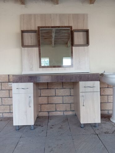 - Böyük kvadrat güzgü: arxa panelə bərkidilmiş, hər iki tərəfdə açıq kublu rəflər aksesuar və kosmetika üçün.