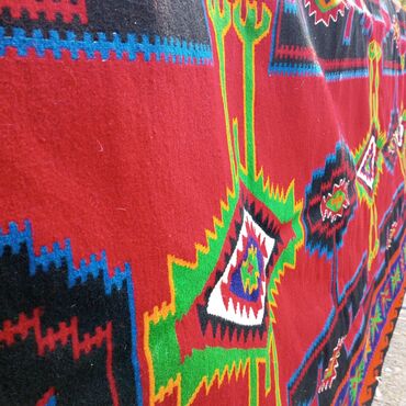 Əl toxuması kilim/xalça - Material: təbii yun iplik - Toxunuş: kilim texnikası (ikiüzlü, yastı toxuma) - Rəng palitrası: canlı qırmızı fon, mavi, ağ, yaşıl, narıncı, bənövşəyi, sarı və qara aksent...