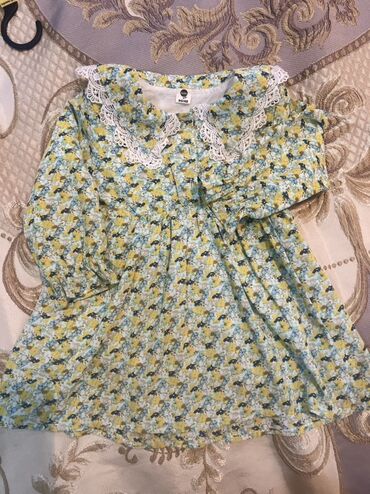 - Solde markalı çiçəkli don: sarı-mavi xırda naxışlar, uzun qollu, beldən enişli kəsim, krujevalı peter-pan üslubunda yaxa, yüngül və rahat parça.