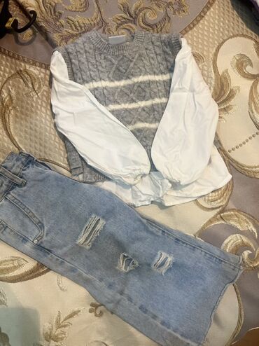 - Ağ uzun qol astarlı, üstü boz trikotaj (toxunma) jiletlə birləşdirilmiş bluz/sviter: dairəvi yaxa, zolaqlı tekstura.