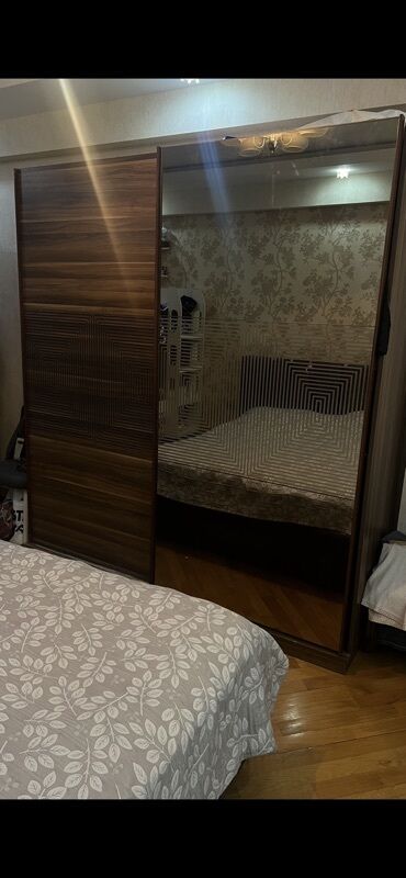- İki qapılı, sürgülü böyük dolab – bir qapısı tam güzgülüdür. Daxildə asılqan və rəf bölmələri, ağac teksturalı tünd qəhvəyi dekor.