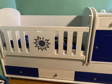Uşaq beşiyi – yan tərəfi sürüşən qoruyucu barmaqlıq və alt hissədə çekmecələr - Material: MDF/laminat tipli taxta, parlaq ağ rəngdə, mavi dekorativ barmaqlıq. - Dizayn: Hər iki başlıq dalğavari fo...
