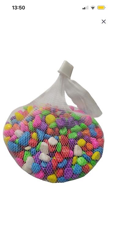 - Dekorativ daşlar: Rəngarəng, hamarlanmış çınqıllar tor kisədə. Dib örtüyü və bəzək üçün istifadə olunur, akvariuma canlı görünüş qatır. Bitkilərin sabit dayanmasına kömək edir.