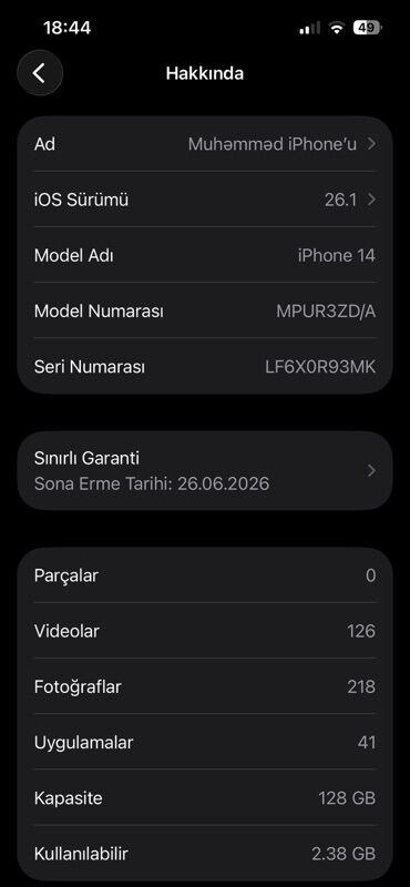 Apple iPhone 14 Purple .128 gb .Telefon normal veziyyeydedi.Ekran orjinalla evez olunub. Kamera orjinall evez olunub.Problemleri yoxdurr.Pil 78 zavod normal zaratqa saxlayır.Face id si düzelendi x...