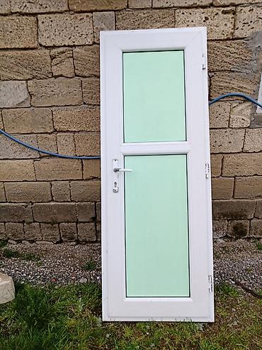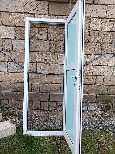- Ağ rəngli plastik qapı: ikitaxtalı dizayn, yuxarı hissədə dar şüşəli bölmə, aşağı hissədə iri (süd rəngli/yaşıl tonlu) mat panel. Dəstinə uyğun tutacaq və menteşələr daxildir. Çərçivə komplekt şəkildədir.