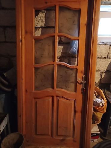 - Taxta iç qapı: təbii rəngli çərçivə və panellər, üst hissədə 6 bölməli şüşə vitraj (naxışlı/mat), alt hissədə iki dekorativ panel. Mexanik tutacaq və kilid mexanizmi var.