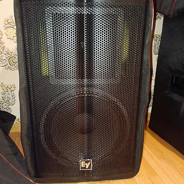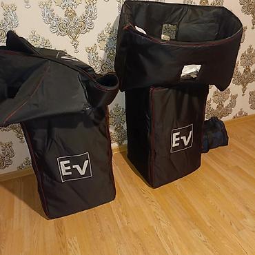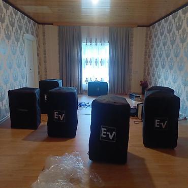- EV markalı passiv/aktiv səhnə akustik si̇stemlər (şəkillərdə tam set: bir neçə 2‑yollu tops və sub kabinetlər).