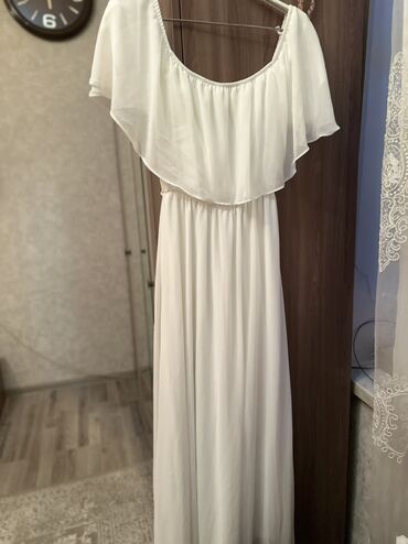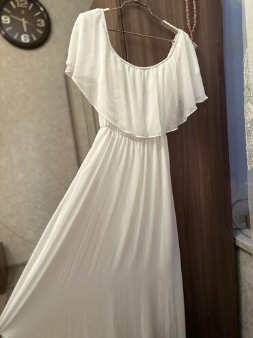 - Üst hissə: geniş dairəvi dekolte, düşən şifon “kape”/volan detalli üst qat, çiyinləri qismən örtür
