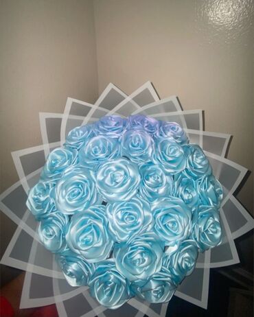 Parlaq mavi rəngli süni gül dəstəsi (buketi) - Material: atlas/parlaq lentdən hazırlanmış dekorativ güllər - Rəng: elektrik mavisi - Bəzəklər: bəzi güllərin mərkəzində incə mirvari tipli detallar ...