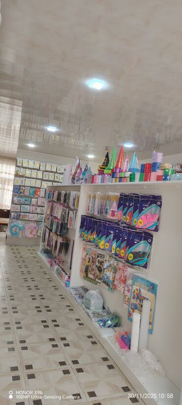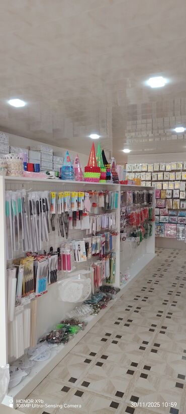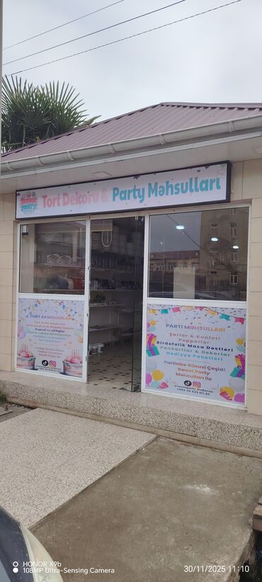Şəkillərdə görünən mağazada geniş vitrində rəngarəng şarlar, pankartlar, hərf bəzəkləri, müxtəlif ölçü və formada tort formaları, peçenye/keks kapsulları, eləcə də peşəkar və evdə istifadə üçün alətlər mövcuddur.