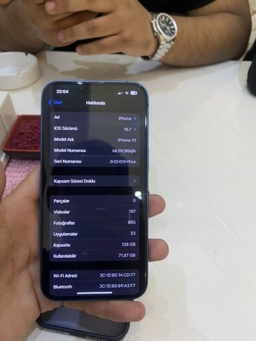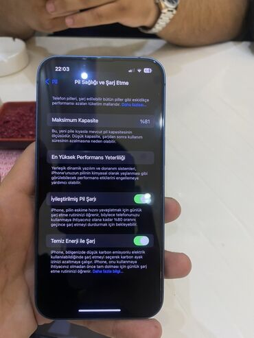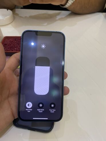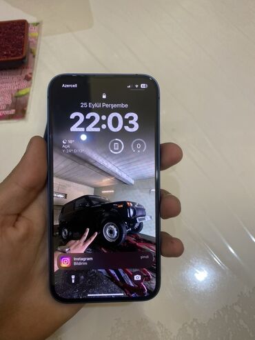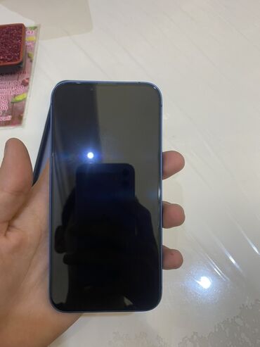 Göy rəngli iPhone 13 mobil telefonu. Bu model, diaqonal yerləşdirilmiş iki kamera sistemi ilə xarakterizə olunur. Arxa tərəfində məşhur Apple loqosu yerləşir. Telefonun arxa şüşəsi zədələnmişdir. Cihazın yanında uyğun qara rəngli qab da görünür.