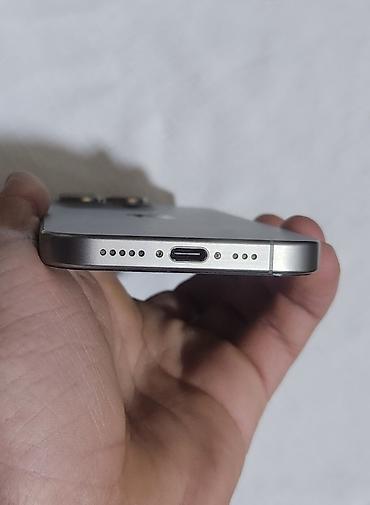Şəkillərdə cihazın ön, arxa və kənar görünüşü, üçlü kamera modulu, USB‑C girişi və Dynamic Island göstərilib. iOS ilə gəlir, App Store tətbiqləri və iCloud xidməti ilə işləyir. Titan boz (Natural Titanium) rəngindədir.