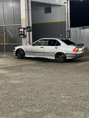 BMW sedan, E36 kuzov. Qara rəng, arxa spoyler və “M” emblemli xarici görünüş. Salon: qara süni dəri və narıncı alcantara kombinasiyalı oturacaqlar, qırmızı tikiş və kant. Ön konsol klassik E36 pane...