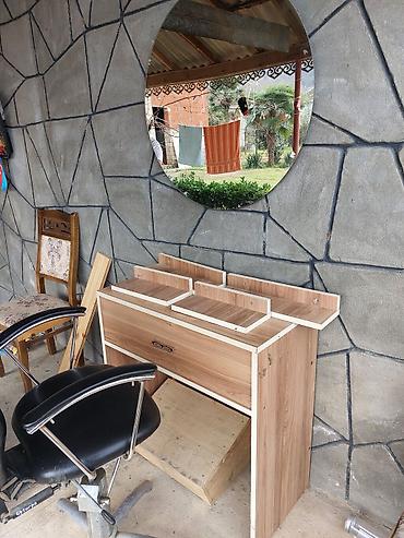 - Taxta iş masası – laminat ağac teksturalı səth, üst hissədə alətlər üçün 3 lövhəli rəf bölməsi, ön tərəfdə çekmece; aşağı hissə ayaq üçün boşluq.