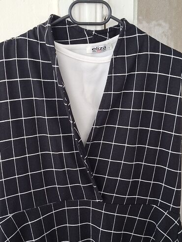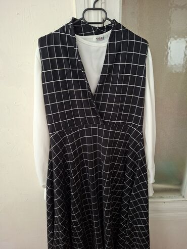 - Model: qara rəngdə ağ xətli kvadrat naxışlı uzun paltar