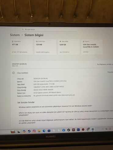 Huawei MateBook d14 Ram: 8gb Ssd: 256gb m2 Cpu: intel core i3 12 ci nəsil Ekran: 14 inç Ekranındı ağ nöqtə var, Birdə touchpad click bəzə işləmir ama sensoru tam işləkdir. Hamsı nəzərə alınıb qiym...