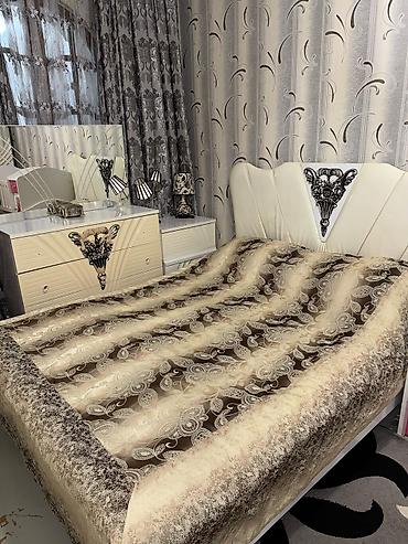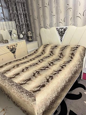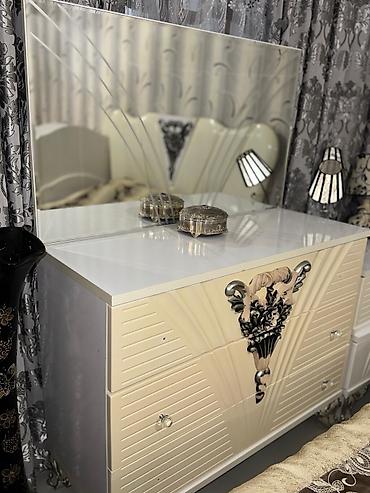 Yataq otağı mebel dəsti - Klassik üslubda komplekt: iri şkaf, geniş çarpayı başlığı ilə birlikdə, 2 ədəd tumbə, güzgülü vizaj masası (komod tipli çekmecələr və yan dolab). - Rəng: krem tonlarda, q...