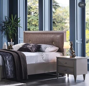 - Yataq: Yumşaq başlıq (deri/parça effektli), zərif dekorativ düymələr, yüksək ayaqlar. Neytral açıq-bej tonlarda korpus, metalik vurğularla.
