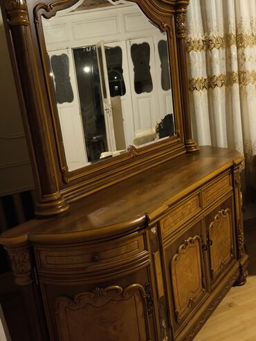 - Ölçülər (təxmini, şəkillərə əsasən): vitrin – hündür; komod + güzgü – geniş və dərin masa səthi ilə