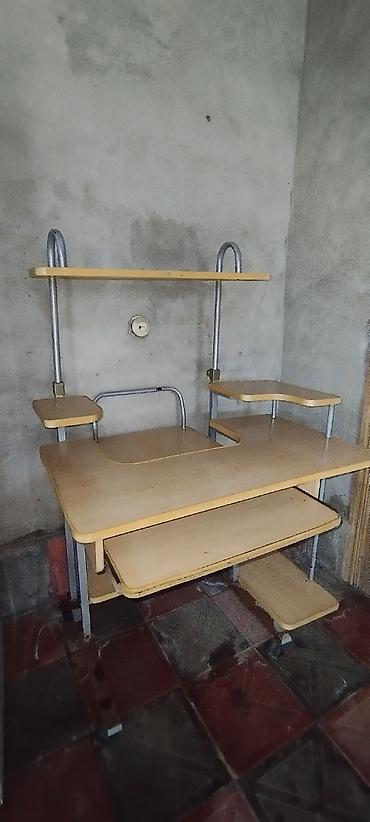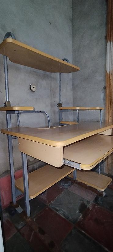 Kompyuter/iş masası – çekmecəli modul ilə - Material: taxta teksturalı laminat (reng açıq palıd tonlarında), ön panellər mat tünd boz. - Konstruksiya: L‑şəkilli üstün panel sağ tərəfə uzanır; sold...
