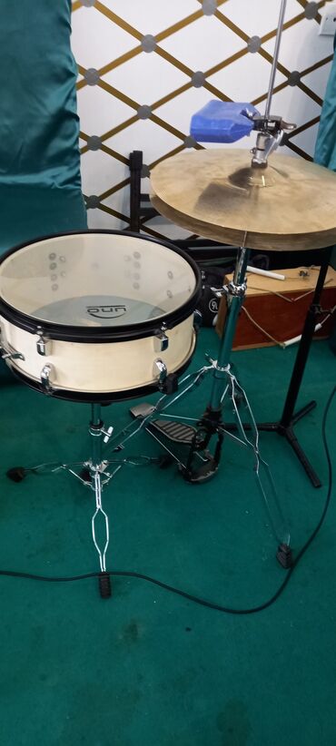 - Snare baraban: ağ ağac gövdə, şəffaf dərili, yanlarında 8/10-liq tənzimləmə boltları, metal halqa və möhkəm tripod stend üzərində.
