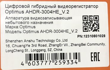 - DVR: Optimus AHDR-3004HE_V.2. Rəqəmsal hibrid videoyazıcı, peşəkar (məişət olmayan) təyinatlı. CE, FCC, RoHS uyğunluğu. Qutuda “Optimus Connect” P2P dəstəyi qeyd olunub. 37 ay Optimus zəmanəti işarələnib. PN: 12310801028.