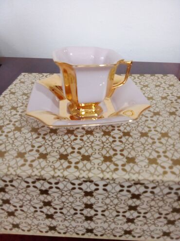 - Fincan-nəlbəki: çoxbucaqlı (oktaqonal) forma, qızılı qulplu fincan və uyğun kvadratvari nəlbəki